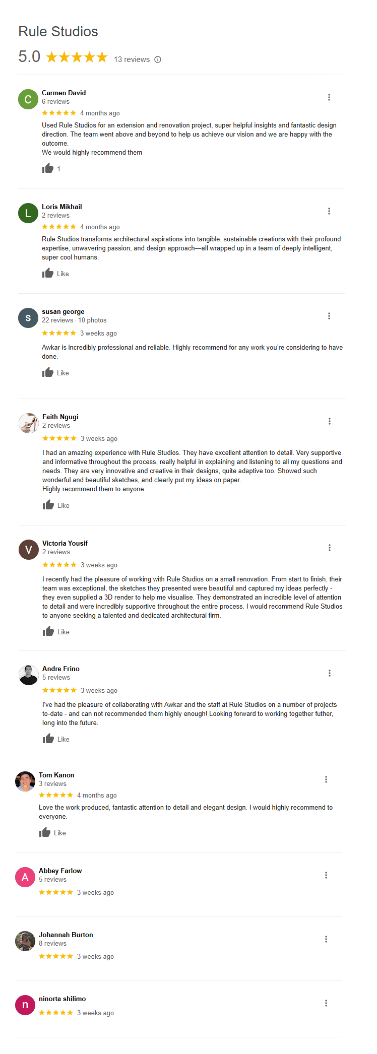 “Used Rule Studios for an extension and renovation project, super helpful insights and fantastic design direction. The team went above and beyond to help us achieve our vision and we are happy with the outcome.”